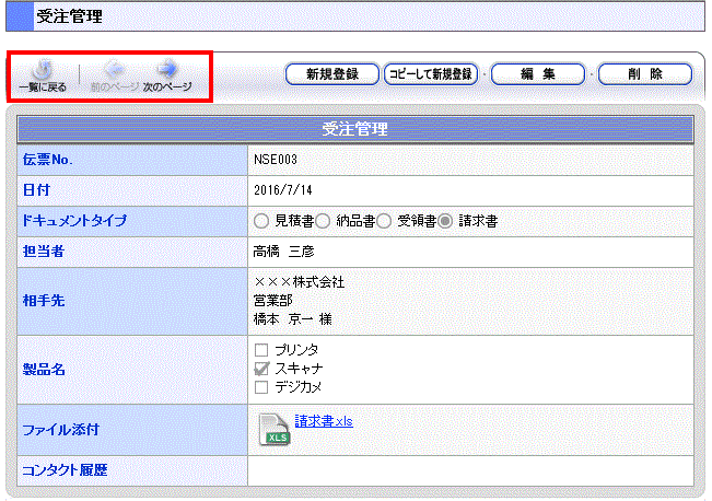[前のページ]または[次のページ]をクリックすると、前または次に登録されているデータの詳細ページに切り替わります。